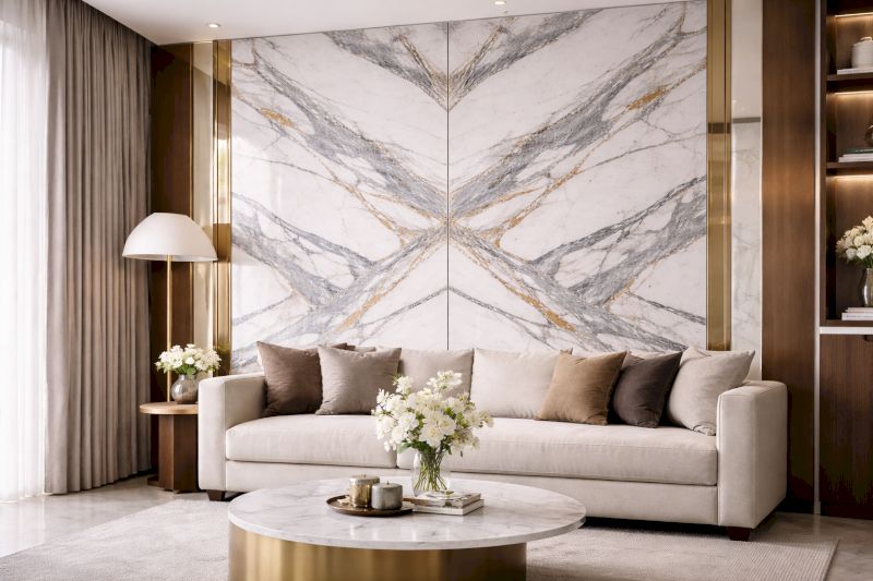 Tông trắng tinh khôi với các đường vân xám nhẹ nhàng, mang lại vẻ đẹp thanh thoát và hiện đại cho phòng khách.